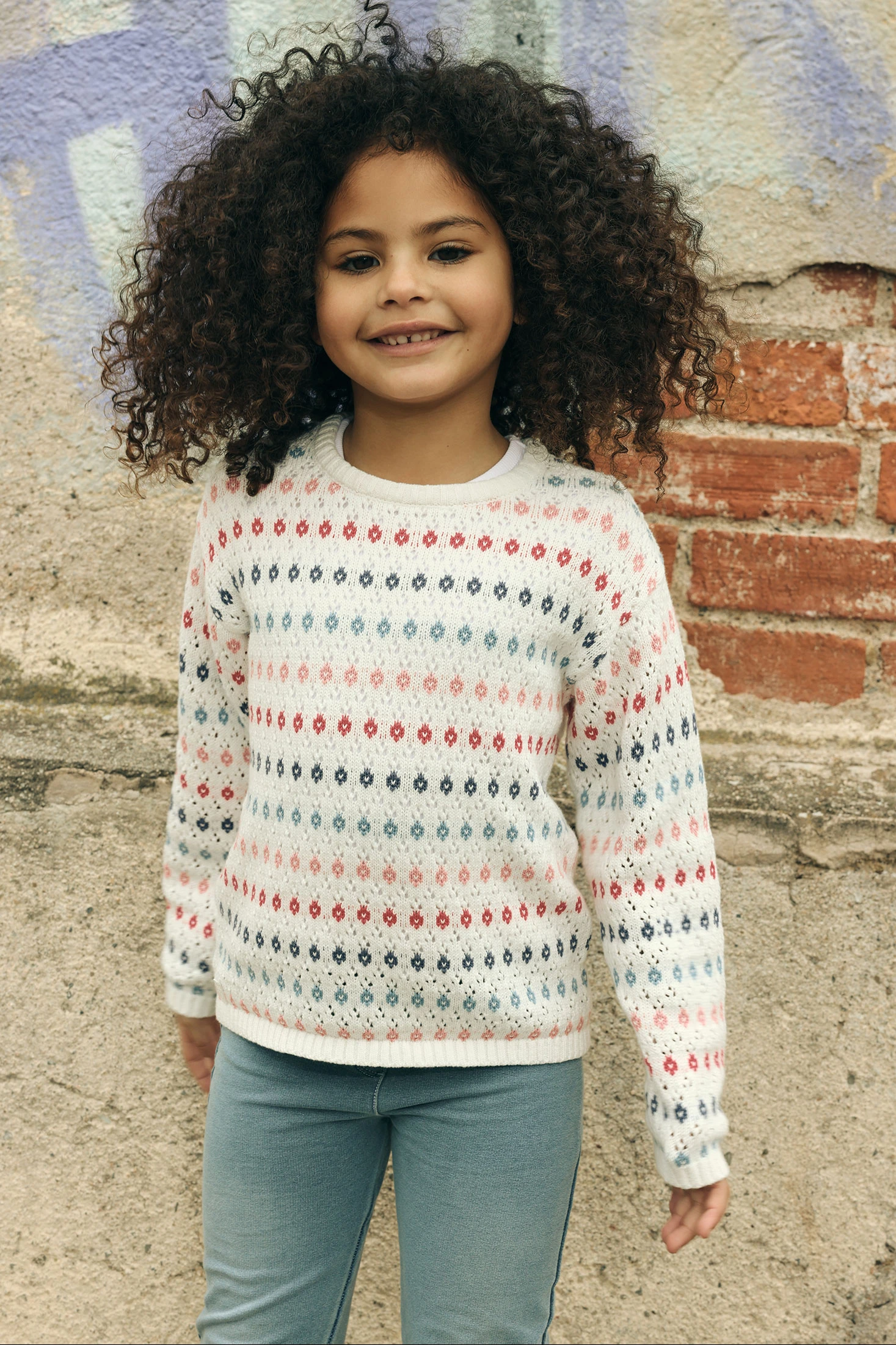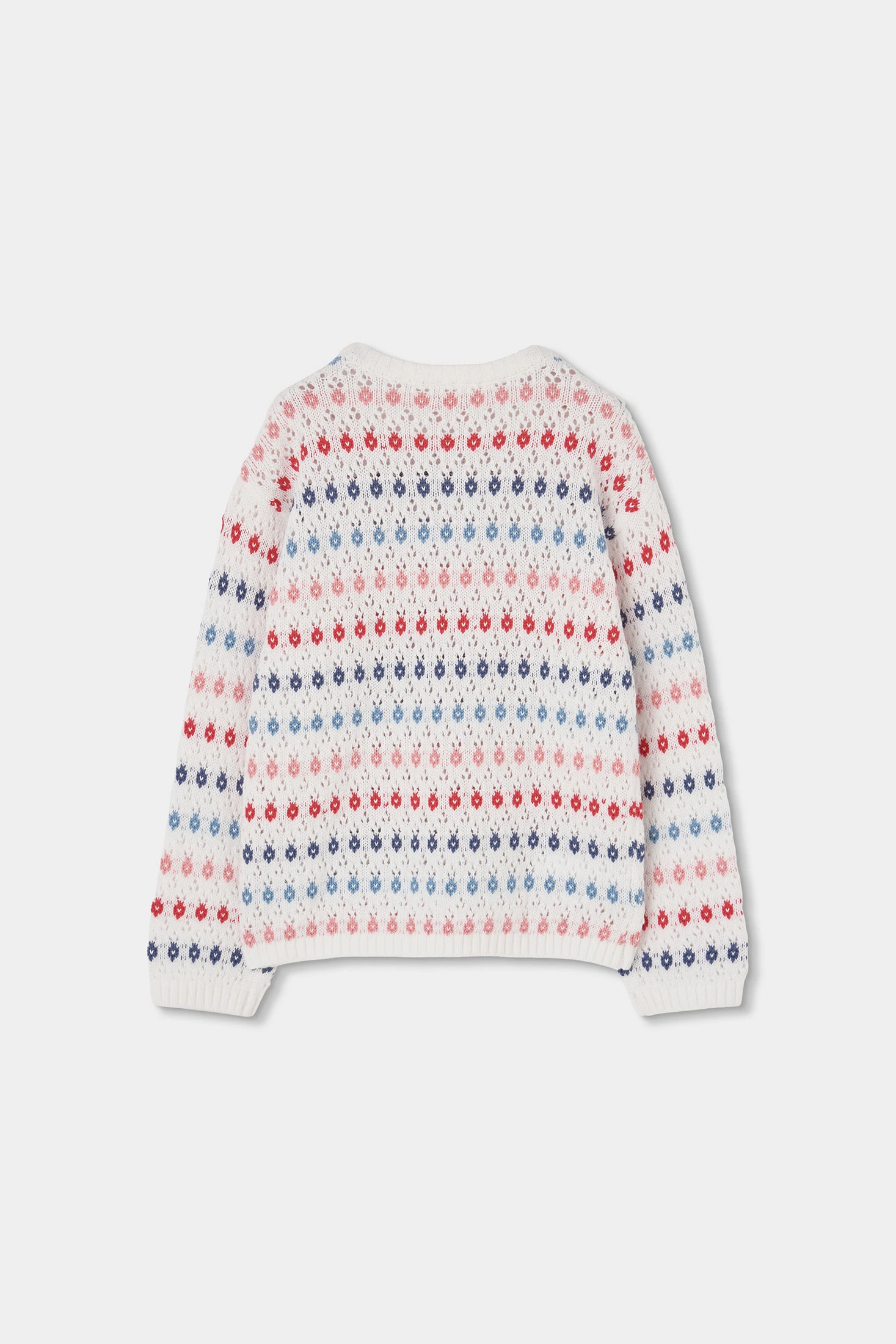 Camisola de algodão de cor branca com recortes e combinada em tons azuis e rosas. O material de algodão garante suavidade e calor, ideal para primavera-verão. Gola redonda e manga comprida. Disponível em tamanhos desde 12 meses até 10 anos, adapta-se a diferentes fases de crescimento. Pode ser facilmente combinada com calças ou saias para um look casual e confortável.